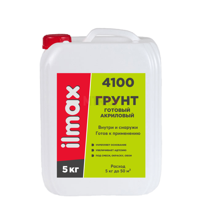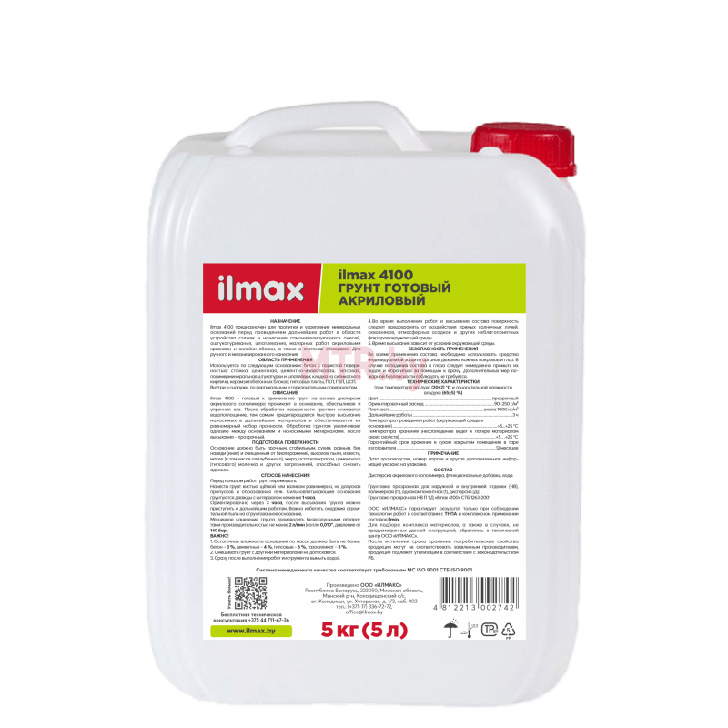 ilmax 4100 грунт готовый акриловый предназначен для пропитки и укрепления минеральных оснований перед проведением дальнейших работ в области устройства стяжек и нанесения самонивелирующихся смесей, оштукатуривания, шпатлевания, малярных работ акриловыми красками и оклейки обоями, а также в системах облицовки. Для ручного и механизированного нанесения.