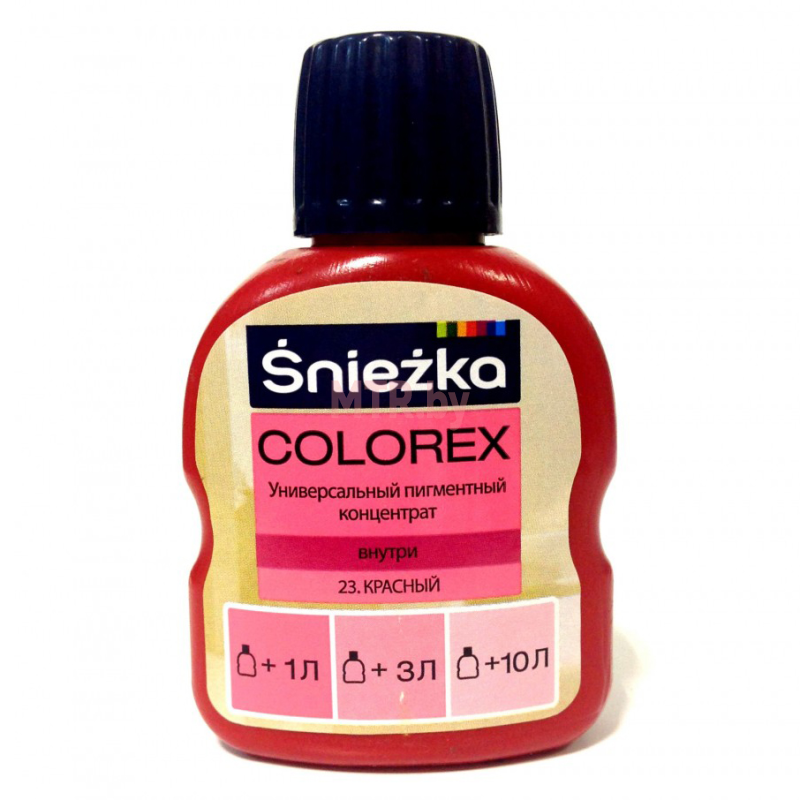 Sniezka Colorex - это водная дисперсия пигментов с добавлением вспомогательных средств, которые так же позволяют сочетать его с изделиями на основе растворителей. Концентрат предназначен для расцветки избранным цветом готовых водорастворимых красок и красок на основе растворителей: эмульсионных, масляно-фталевых, клеевых, нитроцеллюлозных, хлоркаучуковых эмалей, предназначенных для покраски внутри помещений, некоторые цвета используются и снаружи.