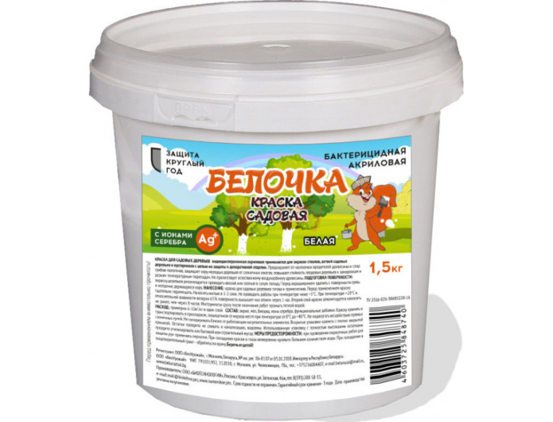 Краска для садовых деревьев, водно-дисперсионная акриловая применяется для защиты стволов и ветвей садовых деревьев, декоративных деревьев и кустарников от солнечных ожогов, насекомых-вредителей, зимующих в трещинах коры, спор грибов-патогенов, грызунов. Образует прочное белое, матовое, «дышащее» покрытие, которое не препятствует воздухообмену, устойчиво к атмосферным осадкам. Краска способствует повышению стойкости деревьев и кустарников к резкому перепаду температур. Не препятствует воздухообмену, устойчива к атмосферным осадкам, защищает от болезней, вредителей и солнечных ожогов, повышает стойкость к зимнему перепаду температур.<br>