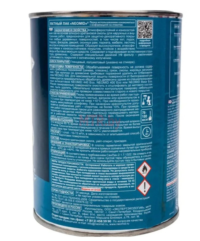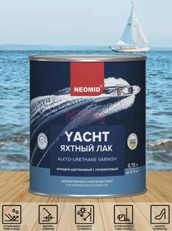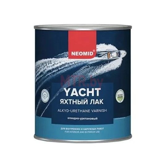 NEOMID яхтный лак – атмосферостойкий и износостойкий лак на основе алкидно-уретановой смолы для наружных и внутренних работ, предназначен для защитно-декоративного покрытия любых деревянных поверхностей, в том числе террас, фасадов, дверей, оконных рам, паркета, мебели, лестниц внутри и снаружи помещений. Образует высокопрочное, атмосферостойкое и износоустойчивое покрытие, стойкое к воздействию воды и бытовых моющих средств. Сохраняет и подчёркивает естественную структуру древесины. Содержит специальный двойной УФ фильтр – увеличивает устойчивость покрытия к солнечному излучению.