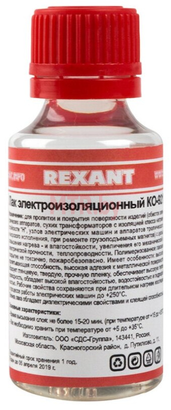 Лак электроизоляционный KO-921 30 мл REXANT предназначен для пропитки и покрытия поверхности изделий (обмоток электрических аппаратов, сухих трансформаторов с изоляцией класса нагревостойкости «Н», узлов электрических машин и аппаратов тропического и морского исполнения, при ремонте грузоподъемных магнитов), с целью повышения нагрево- и влагостойкости, увеличения его механической и электрической прочности и теплопроводности.