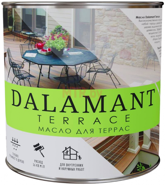 Масло для террас Dalamant Terrace подчеркивает природную красоту дерева, выделяя его структуру. Не образует на поверхности пленку, что позволяет сохранить естественную вентиляцию древесины.