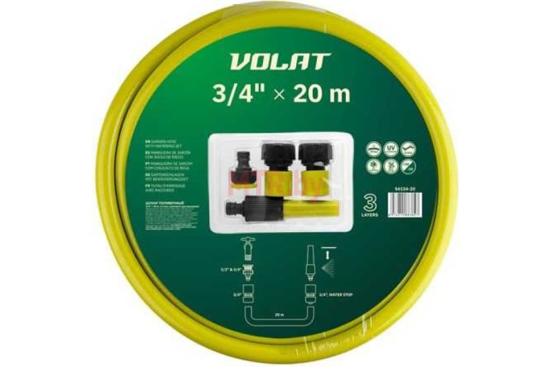 Шланг поливочный Волат с комплектом для орошения (54134-20) предназначен для орошения почвы на садовых и парковых участках.