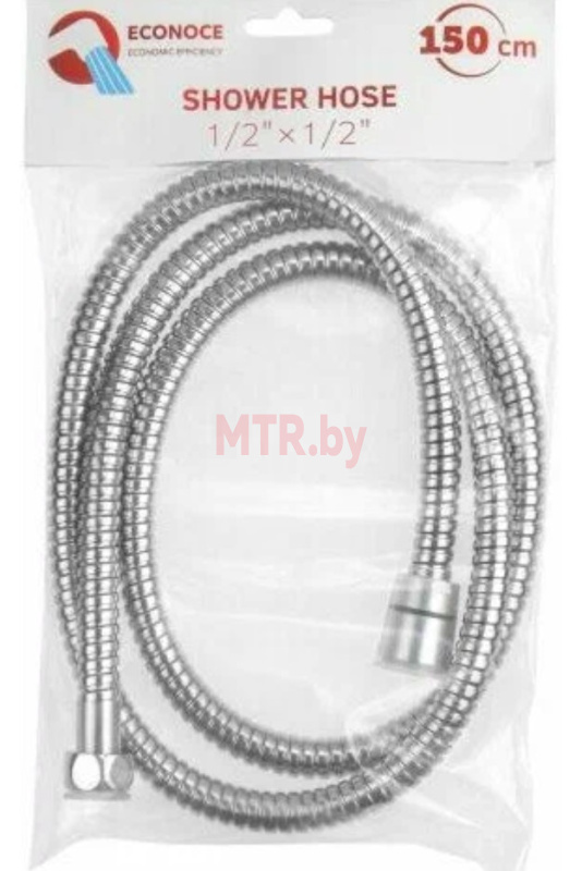 Шланг душевой ECONOCE 150 см (EC001) изготовлен из нержавеющей стали (SUS) для наружного слоя и ПВХ для внутреннего. Гайка выполнена из цинка, закладной фитинг — из нейлона, обжимной фитинг — из нержавеющей стали. Диаметр шланга составляет 14 мм, а его длина — 1,5 метра.