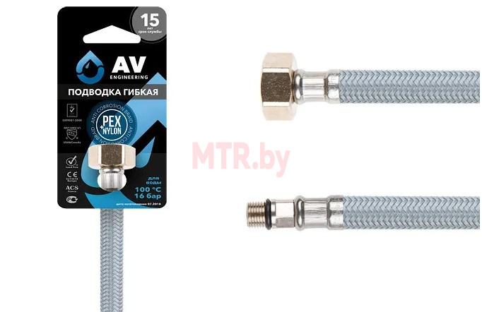 Гибкая подводка для воды иголка м10 короткая - гайка 1/2 100 см AV Engineering (AVE215100) - приспособление, позволяющее соединять два стационарных вывода воды, причем они (выводы) могут располагаться под любым углом и на любом расстоянии друг от друга. Подводка предназначена для подключения смесителя, бойлера, газового котла, унитаза к системе водоснабжения жилых и частных домов, промышленных предприятий. Отличается простотой монтажа, длительным сроком службы и универсальностью. Концевая присоединительная арматура из никелированной латуни. Материал внутренней трубки - EPDM-резина. Наружная оплётка из ПВХ. Уплотнительное кольцо - EPDM-резина. Обжимная гильза из нержавеющей стали AISI-304 с защитным слоем.