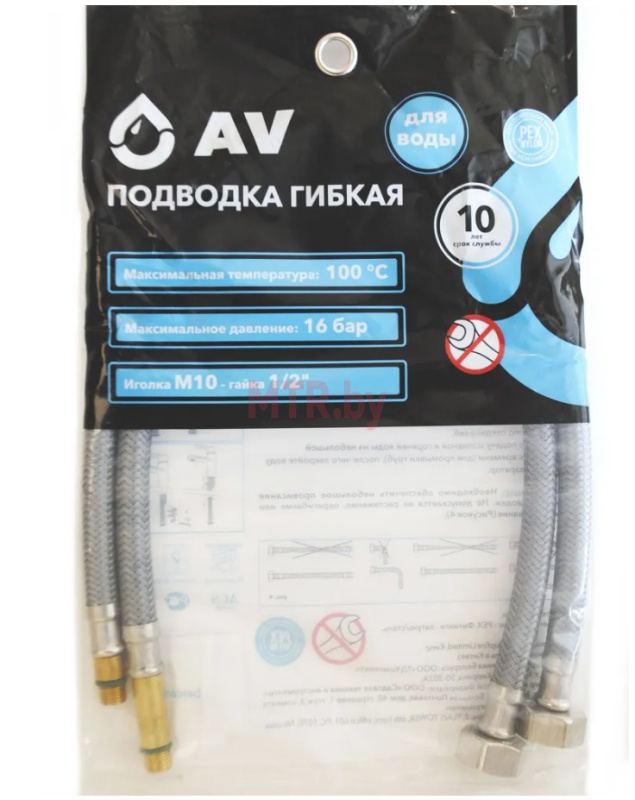 Гибкая подводка для воды 1/2" x M10 x 50 см AV ENGINEERING (AVE21850) предназначена для подключения отдельного сантехнического оборудования к основной системе водоснабжения и изготавливается только из высококачественных материалов, что обеспечивает высокую эластичность и многолетнюю исправную работу. Подводка гибкая для смесителя (nylon Lt иголка м10 - гайка 1/2" 50 см) применяется для систем отопления и водоснабжения и включает в себя два шланга: один - с длинной иголкой м10 и гайкой 1/2", второй - с короткой иголкой м10 и гайкой 1/2". Длина шланга 50 см. Максимальная температура 100 °С. Максимальное давление 16 атм. Наружная оплетка выполнена из нейлона, концевая присоединительная арматура из никелированной латуни. Обжимная гильза выполнена из нержавеющей стали AISI-304 с защитным слоем, уплотнительное кольцо – EPDM-резина. Комплект гибкой подводки может использоваться для питьевой воды. Гарантия 5 лет, расчетный срок службы 15 лет.