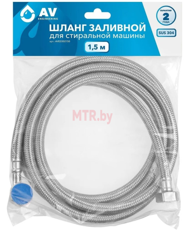 Шланг заливной для стиральной машины AV ENGINEERING SUS 1,5 м (AVE3302150) предназначен для использования со стиральными машинами с резьбой подключения 3/4". Фитинги выполнены из латуни, шланг из нержавеющей стали. Имеет максимальную рабочую температуру 25С, а давление 10 бар. Подключение: гайка-гайка.