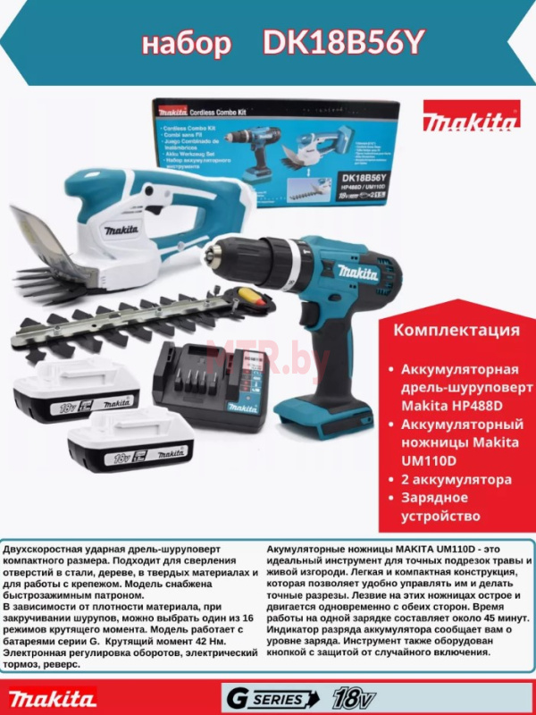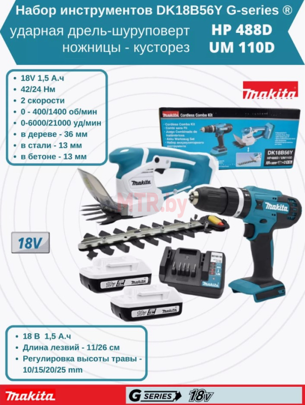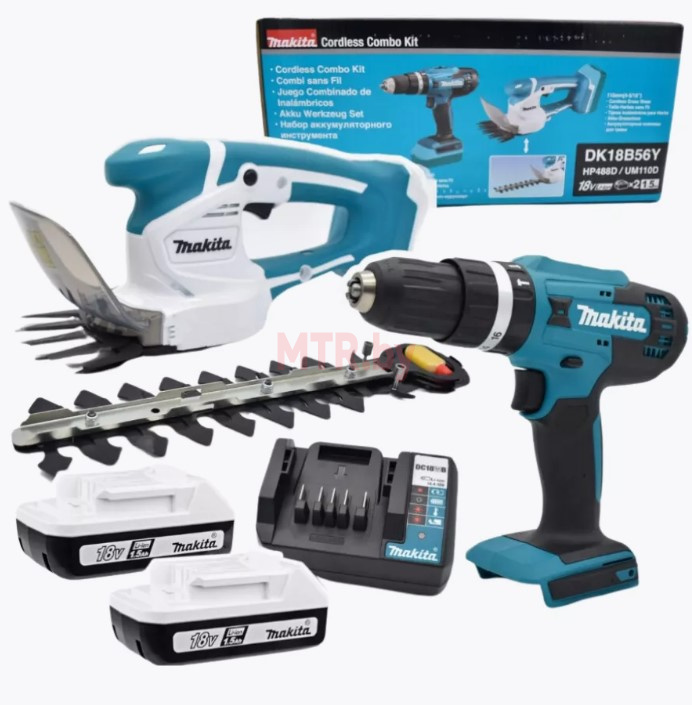 Дрель-шуруповерт аккумуляторная ударная MAKITA HP488D и кусторез аккумуляторный UM110D (DK18B56Y) - готовый набор для строительных и садовых работ.