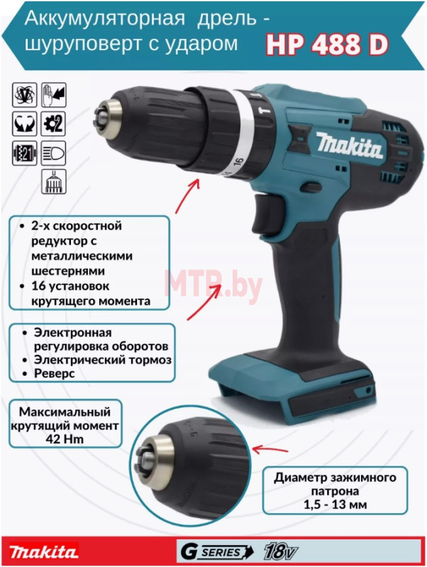 Дрель-шуруповерт аккумуляторная ударная MAKITA HP 488 D - 2-скоростная ударная дрель-шуруповерт компактного размера. Крутящий момент 42 Нм. Электронная регулировка оборотов, электрический тормоз, реверс. Ударный механизм для работы с твердыми материалами. Дрель-шуруповерт подходит для сверления отверстий в стали, дереве, в твердых материалах и для работы с крепежом.