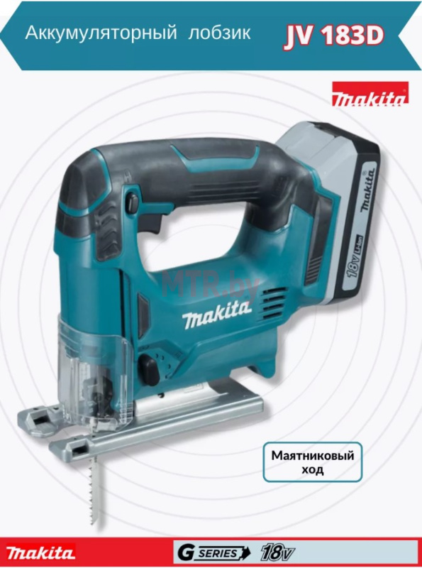 Лобзик аккумуляторный JV183D имеет маятниковый ход, что позволяет подстраиваться под конкретный тип материала. Регулировка скорости осуществляется посредством усилия нажатия на клавишу "Пуск". Пластиковый защитный экран препятствует попаданию металлической и древесной стружки в лицо оператору. Инструмент работает с батареями серии G.