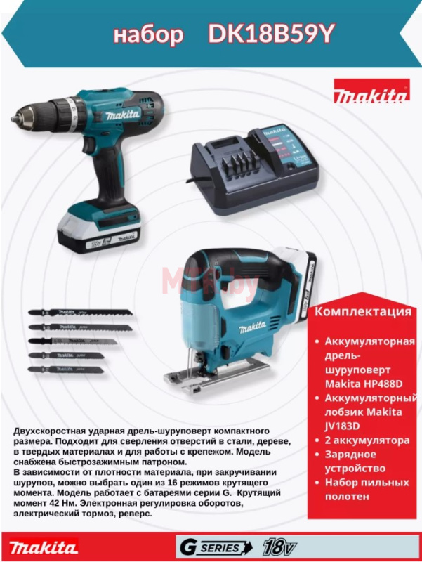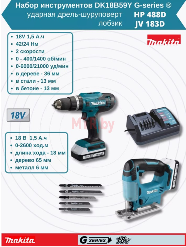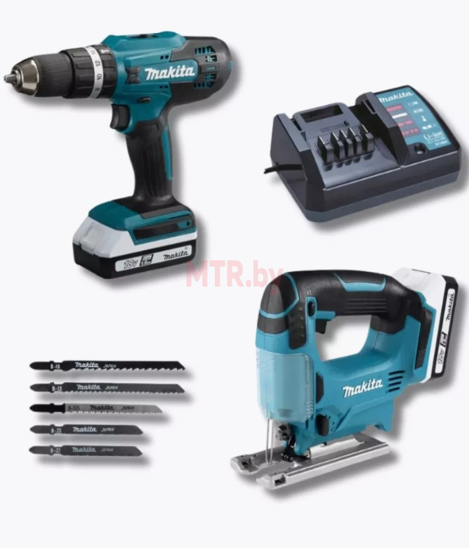 Дрель-шуруповерт аккумуляторная ударная MAKITA HP488D и лобзик аккумуляторный JV183D (DK18B59Y) - готовый набор для строительных работ.