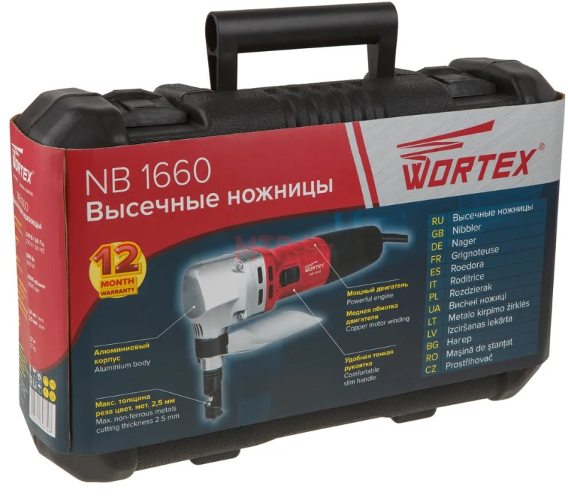 Ножницы высечные WORTEX NB 1660 (NB1660M0018) с алюминиевой редукторной частью и тонкой рукояткой. Номинальное напряжение: 230 В. Номинальная частота: 50 Гц. Максимальная толщина резки: сталь 1,8 мм; нержавеющая сталь 1,2 мм; цветные металлы 2,5 мм.