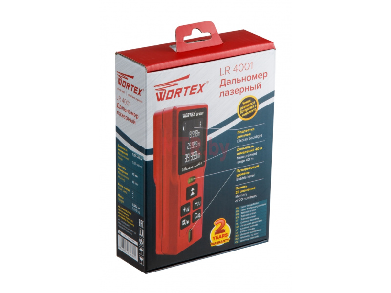 Дальномер лазерный WORTEX LR 4001 Цифровой лазерный дальномер оснащен современными лазерными технологиями, что гарантирует высокую точность и надежность результатов измерения. Функционально прибор измеряет длину, площадь, объем, возможно применение теоремы Пифагора. Для удобства использования в слабоосвещенных помещениях предусмотрена подсветка дисплея.