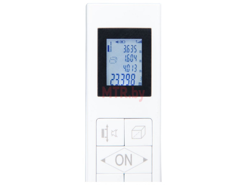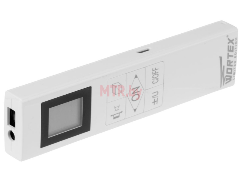 Цифровой лазерный дальномер имеет двухсторонний лазерный луч, что позволяет производить измерения из любой точки помещения. Измеренные дистанции первым и вторым лучом отображаются по отдельности как отрезки а и b, при этом автоматически вычисляется их сумма. Прибор также измеряет площадь, объем, вычисляет сумму, возможно применение теоремы Пифагора. Для удобства использования в слабоосвещенных помещениях предусмотрена подсветка дисплея. Дальномер оснащен перезаряжаемой Li-ion батареей.