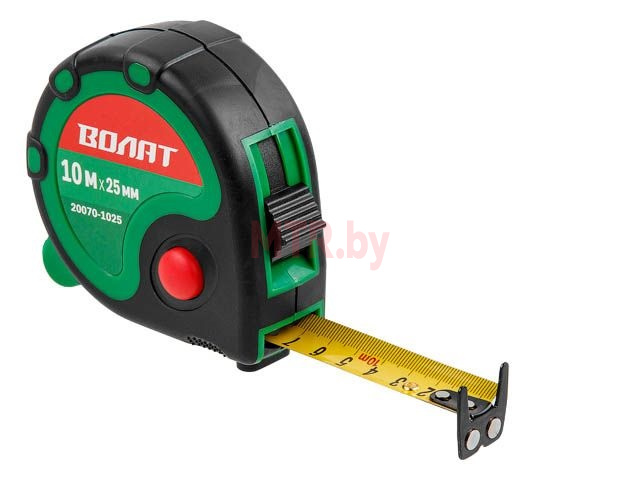 Рулетка 10 м ВОЛАТ (20070-1025) применяется при выполнении измерительных или разметочных работ. Корпус закрытый, изготовлен из ABS-пластика и имеет обрезиненное покрытие, данное покрытие препятствует выскальзыванию из рук. Инструмент удобен в использовании. 3 механизма фиксации ленты, двухсторонняя шкала нанесения, магнитный наконечник.