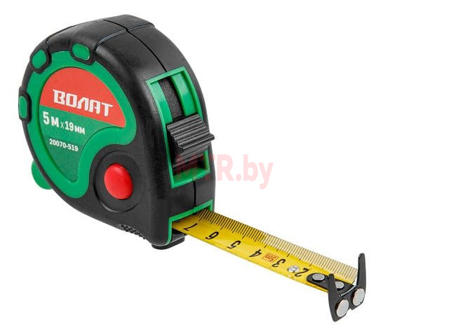 Рулетка 5 м ВОЛАТ (20070-519) применяется при выполнении измерительных или разметочных работ. Корпус закрытый, изготовлен из ABS-пластика и имеет обрезиненное покрытие, данное покрытие препятствует выскальзыванию из рук. Инструмент удобен в использовании. 3 механизма фиксации ленты, двухсторонняя шкала нанесения, магнитный наконечник.
