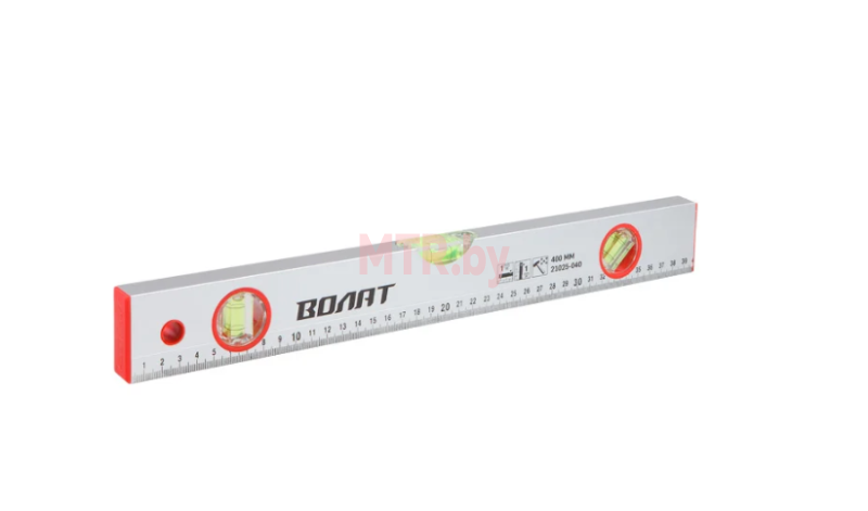 Уровень 400 мм ВОЛАТ 21025 (21025-040) предназначен для контроля вертикальности и горизонтальности поверхности. Уровень оснащен тремя ампулами: горизонтальная, вертикальная и под углом 45 градусов. Имеет форму бруска с толщиной профиля 0,6 мм.