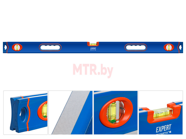 Уровень 1000 мм STARTUL Expert SE3550 (SE3550-100) имеет ударопрочный X-профиль, выполнен из алюминия. На корпусе установлены 3 акриловые блочные колбы небьющиеся (1 колба – измерение горизонтали, 2 ватерпаса – измерение вертикали). На концах изделия имеются пластмассовые концевые колпачки. Прорезиненные ручки для более удобного захвата.