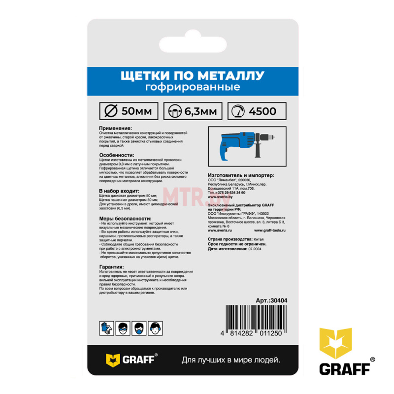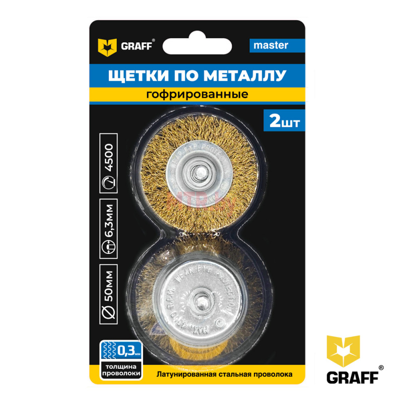 Щетки гофрированные по металлу Graff изготовлены из металлической проволоки диаметром 0,3 мм с латунным покрытием. Гофрированная щетина отличается большей мягкостью, что позволяет обрабатывать поверхности из цветных металлов, алюминия без риска сильного повреждения материала конструкции.