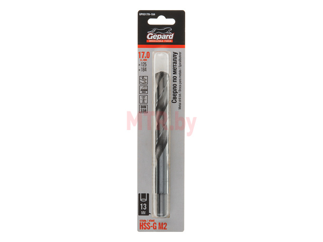 Сверло по металлу спиральное 17х125х184 мм GEPARD HSS-G (GP03170-184) предназначено для сверления отверстий в конструкционных углеродистых и легированных сталях, цветных металлах, чугуне, твердом пластике. Сверло спиральное изготовлено из высококачественной быстрорежущей стали с уже вышлифованным профилем. Выход стружки легче, температура нагрева и биение сверла в патроне меньше, стойкость режущей части выше. Отверстия имеют высокую точность. Подточка поперечных режущих кромок позволяет начинать сверление без предварительного засверливания центрирующим сверлом или кернения. Марка стали: М2 (соответствие Р6М5). Стандарт: DIN 338. Тип обработки поверхности сверла: полированное. Метод изготовления: фрезеровка c уже вышлифованным профилем (fully ground). Класс точности: А.