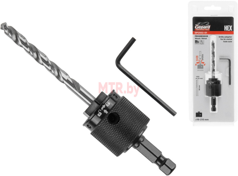Центрирующее сверло для коронок биметаллических с шестигранным быстросъемным переходником GEPARD Progressor (GP2502-01) – элемент для смены коронки в одно движение. Если раньше требовались разные хвостовики (один для коронок диаметром 14-30 мм, другой для 32-210 мм), то теперь для новой серии биметаллических коронок GEPARD Progressor GP2550 требуется один единый для всех диаметров.