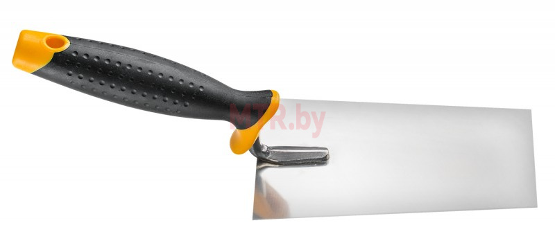 Двухкомпонентная ручка с нескользящим покрытием, полированная нержавеющая сталь. На рукоятке имеется отверстие для подвешивания кельмы и удобного хранения.