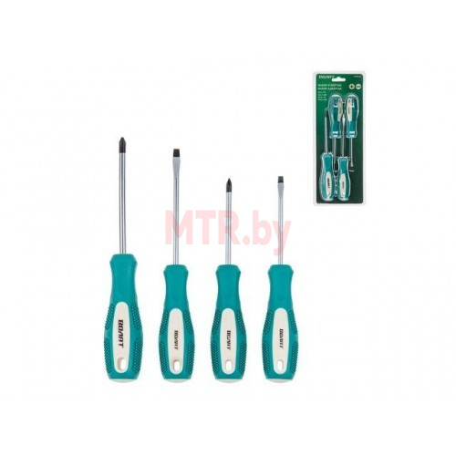 Набор отверток 4 предмета ВОЛАТ (17085-04) используется для монтажа и демонтажа резьбовых соединений. В состав набора входят крестовые и шлицевые отвертки SL4х75, SL5х100, PH1х75, PH2х100