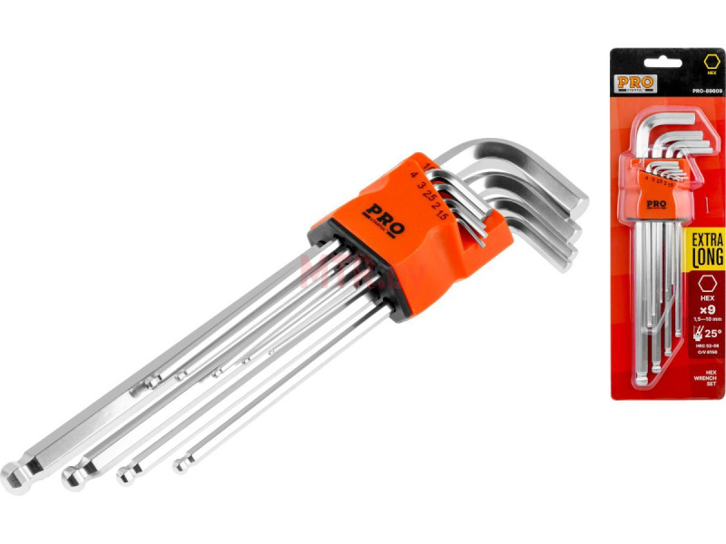 Набор ключей шестигранных 1,5-10 мм 9 предметов длинных PRO STARTUL (PRO-89109) состоит из 9 инструментов Г-образной формы с разнодлинными сторонами, предназначенных для откручивания и закручивания болтов с внутренним шестигранником.