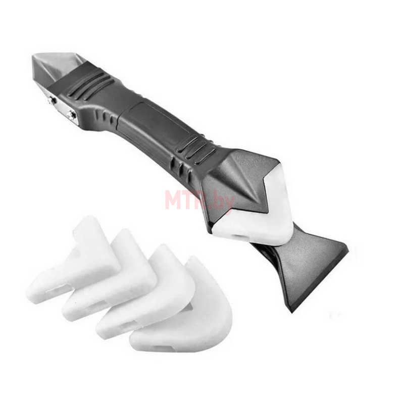 Силиконовый шкребок-скребок для герметика 3 в 1 для удаления/выравнивания герметика включает в себя два шпателя и набор сменных разглаживающих насадок (R1, R2, R3, R4, R5).