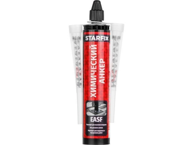 Анкер химический STARFIX EASF 300 мл (SM-66658-1) - это высокоэффективная двухкомпонентная эпокси-акрилатная смола, не содержащая стирол. Специально разработан для крепления широкого спектра строительных материалов в основаниях из всех видов бетона и кирпича. Предназначен для высоких нагрузок. Может применяется для установки арматуры периодического профиля и организации арматурных выпусков в монолитном железобетоне диаметром М8-М32.