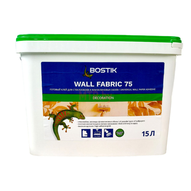 Клей обойный BOSTIK Wall Fabric 75 15 л (BOK003902) - готовый к применению клей Bostik Wall Fabric 75 предназначен для стеклообоев и флизелиновых фотообоев, виниловых и тяжелых обоев до 420 г/м². После высыхания соединение становится прозрачным. Прежде чем приступить к оклейке обоев, следует ознакомиться с рекомендации производителя обоев. Может использоваться на известково-цементных штукатурах и гипсокартоне внутри помещений.