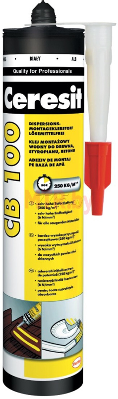 Ceresit CB 100 предназначен для склеивания большинства видов строительных материалов: дерево, полистирол, кирпич, керамика, бетон, гипсокартон, полистирол, пенополистирол, древесноволокнистые плиты, фанера, дерево, жесткий ПВХ, камень, ДСП, ДВП и многие виды пластмасс* внутри зданий. Одна из склеиваемых поверхностей должна быть впитывающей воду. Может заполнять мелкие дефекты в подложке и трещины до 10 мм. Не рекомендуется для конструкций и изделий, подвергающихся постоянному воздействию воды, ПЭ, ПП, ПТФЭ.