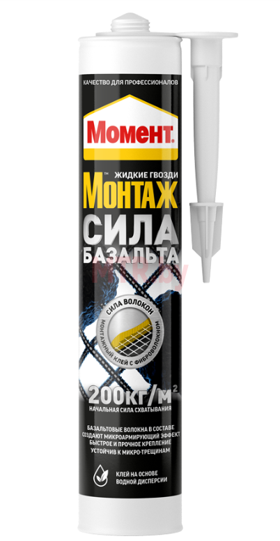 Монтажный клей Момент Монтаж Сила Базальта благодаря базальтовым волокнам в составе создает сильнейшее соединение склеиваемых элементов. Базальтовые волокна распределяются внутри клеевого шва и создают эффект микроармирующей сетки.