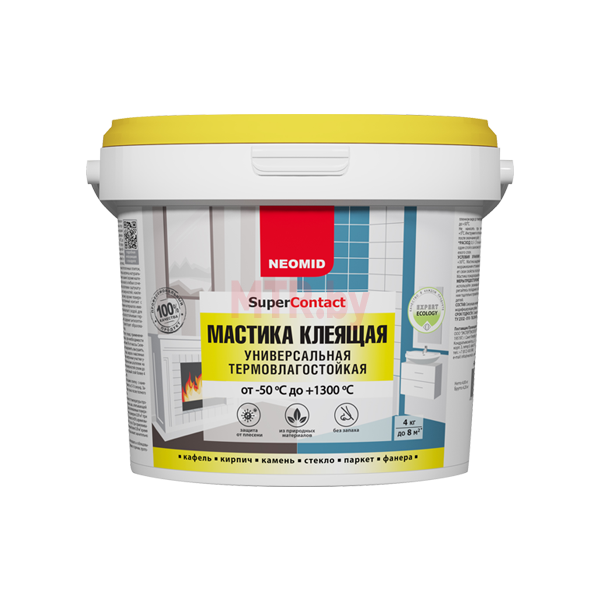 Мастика клеящая НЕОМИД термостойкая универсальная 1,5 кг предназначена для кладки и облицовки печей и каминов, склеивания кафельной и метлахской плитки, стекла, пенополистирольных потолочных плиток, дерева, картона, бетона, кирпича, натурального и искусственного камня (кроме материалов на гипсовой основе) в любых сочетаниях, неглубокой шпатлевки оштукатуренных и бетонных поверхностей, наклеивания фанеры на стяжку (кроме поверхностей, имеющих постоянный контакт с водой).
