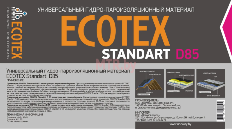 Универсальная гидро-пароизоляционная пленка ECOTEX Standart D 85 применяется как гидро-пароизоляция в неутепленных и утепленных кровлях, конструкциях стен, межэтажных и бетонных перекрытиях.
