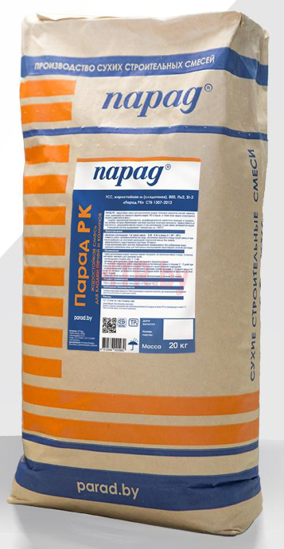 ПАРАД РК - жаропрочная сухая смесь для кладки печей, каминов, тепловых агрегатов и прочих конструктивных элементов с температурой нагрева до +800 °С при их эксплуатации снаружи и внутри помещений.
