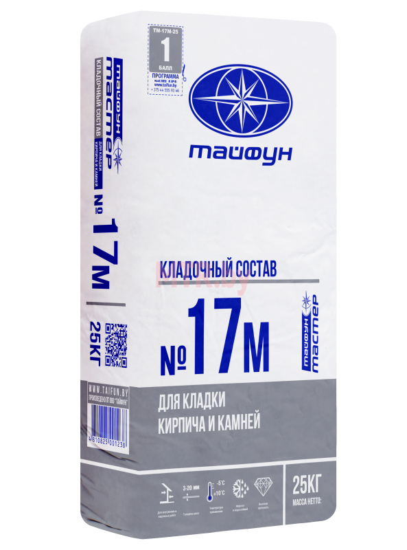 Кладочный состав «Тайфун Мастер» № 17М применяется для кирпичной и каменной кладки стен и перегородок из кирпича, природных и искусственных камней и других штучных стеновых материалов, имеющих низкое водопоглощение. Используется для заполнения выбоин, сколов и трещин в кладке.