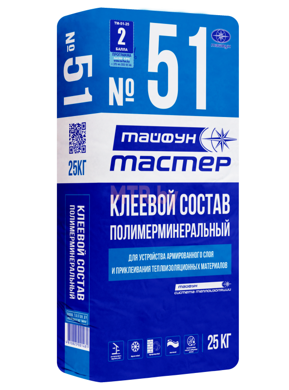 «Тайфун Мастер» №51 (№51М) производится в виде сухой смеси, состоящей из цементного вяжущего, заполнителя, полимерного связующего и специально подобранных модифицирующих добавок высокого качества. Благодаря сбалансированному составу продукт обеспечивает:
