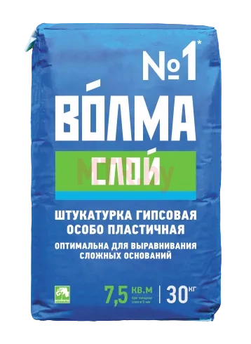 ВОЛМА-Слой - сухая штукатурная смесь на основе натурального гипса, легкого заполнителя, минеральных наполнителей и модифицирующих добавок, обеспечивающих высокую адгезию, водоудерживающую способность и оптимальное время работы.